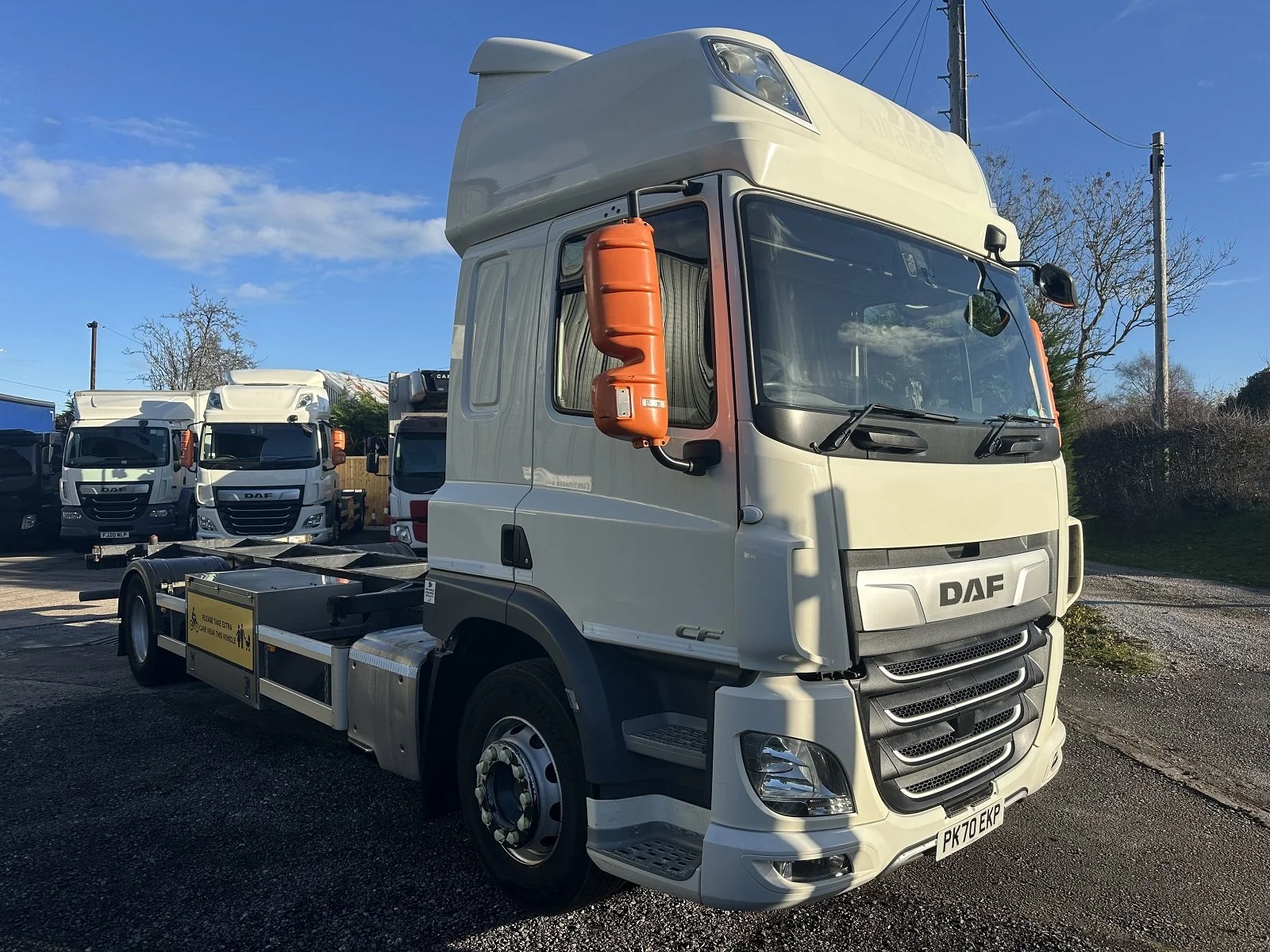 2020 (70) DAF CF 370BHP (11 Litre) Automatic Space Cab 5.7 Metre Wheelbase Chassis on Full (front and rear) height adjustable Air suspension. Fantastic spec with Air Seats arm rests air con and so much more. Also equipped with an Abel Demount system to accommodate a 24ft body and A VBG Air coupling to the rear. Mileage 476,000Km’s and in superb condition. Choice of 2!!